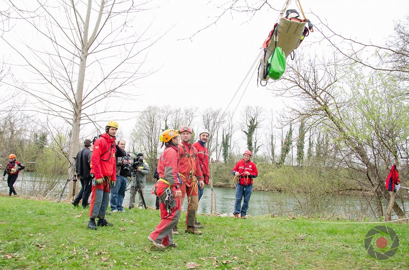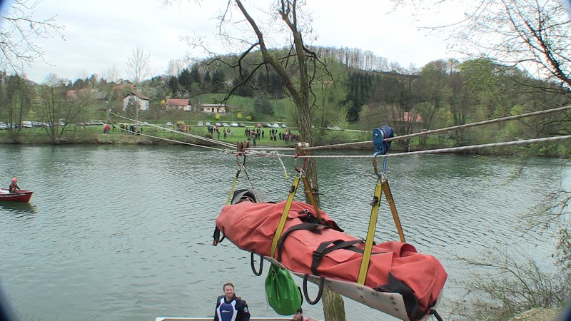 Najdeno osebo reševalci Jamarske reševalne službe Novo mesto pričnejo ob 12:00. uri z vrvno tehniko reševanja z vrvno vodoravno žičnico vleči iz levega na desni brek reke Krke.
