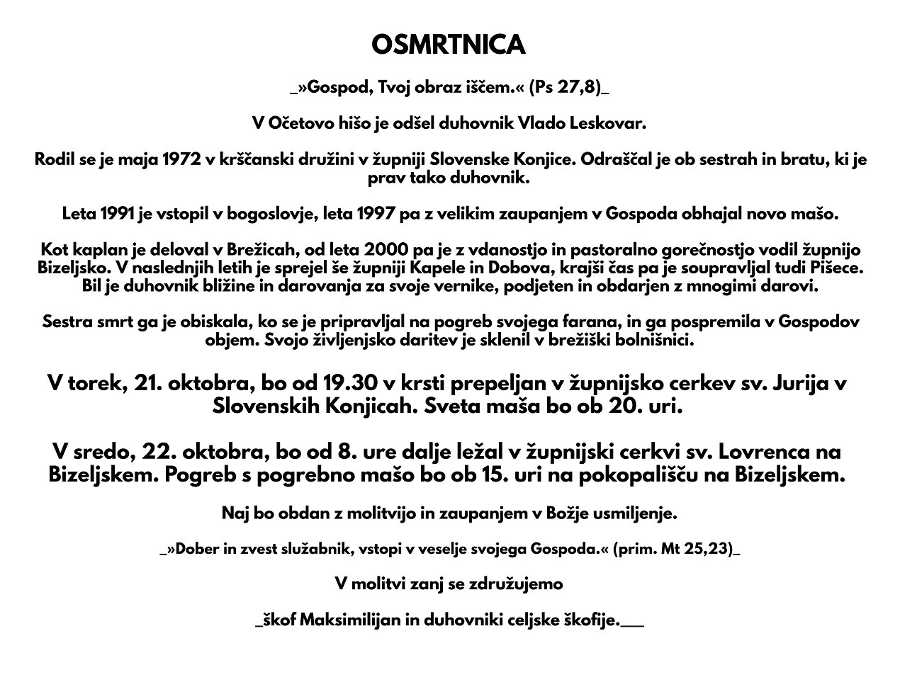 Z žalostjo sporočamo, da nas je včeraj nenadoma zapustil župnik Vlado Leskovar, človek z veliko začetnico, ki je s svojim delom, toplino in spoštljivim odnosom do sočloveka pustil globoko sled v naši skupnosti.