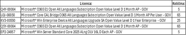 Predmet javnega naročila je najem Microsoft licenc v obliki licenčne pogodbe MS Open Value Subscription GOVT (OVS) za obdobje od 1.2.2026 do 31.1.2029 in sicer v naslednjih količinah: