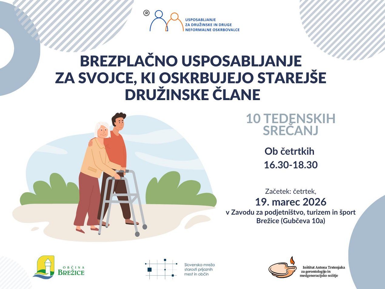 Deli na FBNatisniGalerijaObčina Brežice obvešča, da bo potekalo brezplačno usposabljanje za svojce, ki oskrbujejo starejše, bolne ali onemogle družinske člane.