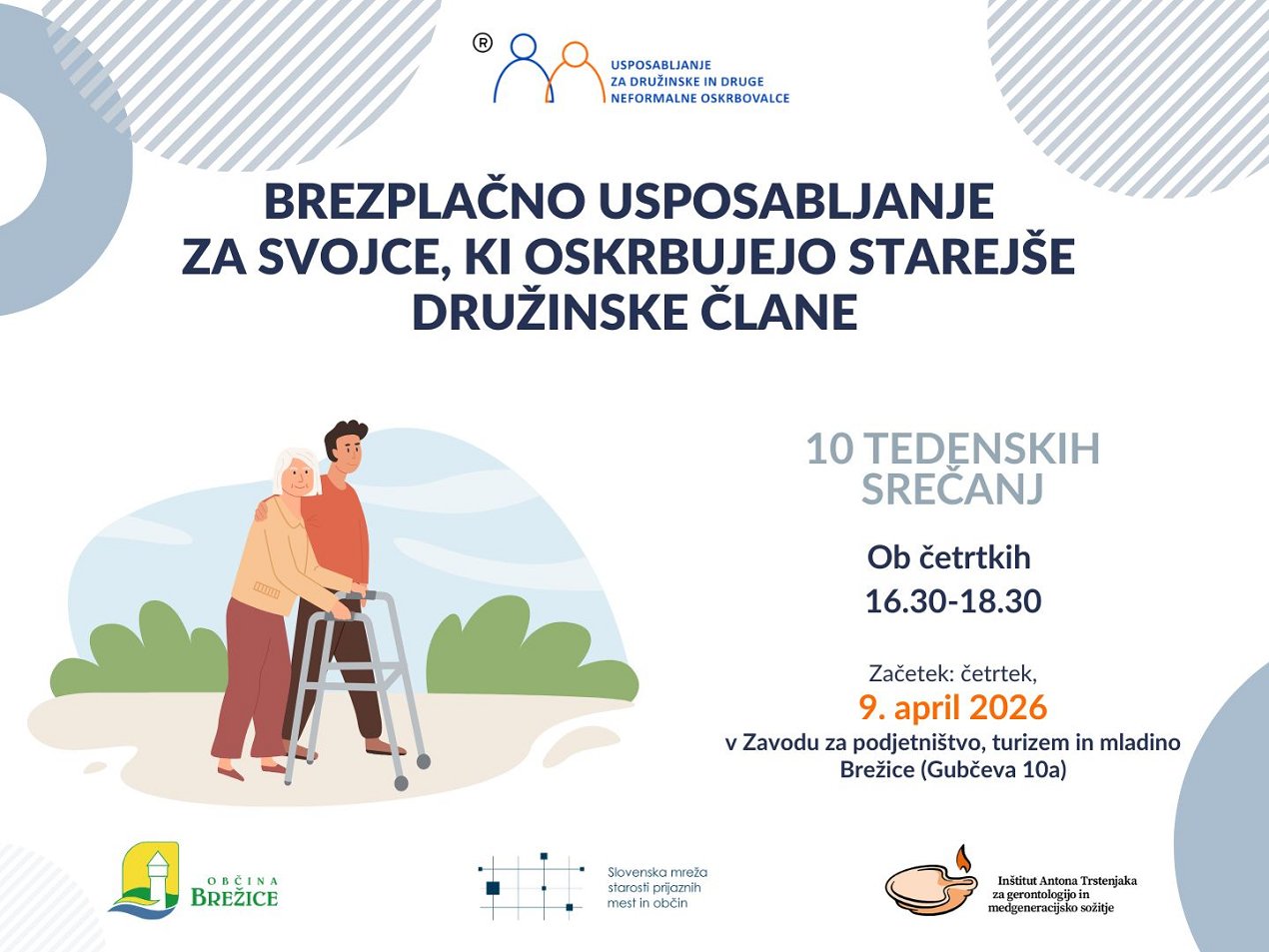 Postani usposobljen neformalni oskrbovalec – znanje, ki olajša življenje - Izvajalec usposabljanj je Inštitut Antona Trstenjaka za gerontologijo in medgeneracijsko sožitje. Izvedli bodo 10 tedenskih srečanj v skupini od 15 do 25 udeležencev. Prvo srečanje bo potekalo v četrtek, 9. aprila 2026, ob 16.30 v prostorih ZPTM Brežice.