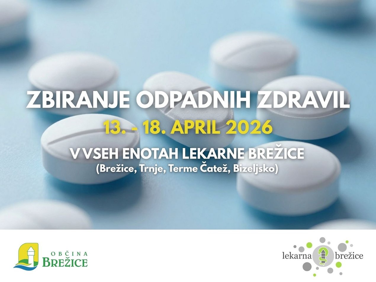 Občina Brežice v sodelovanju z Lekarno Brežice organizira akcijo zbiranja odpadnih zdravil. Neuporabljena zdravila in zdravila s pretečenim rokom uporabe lahko prinesete v vse enote Lekarne Brežice (Brežice, Trnje, Bizeljsko in Terme Čatež) od ponedeljka, 13. do sobote, 18. aprila 2026.